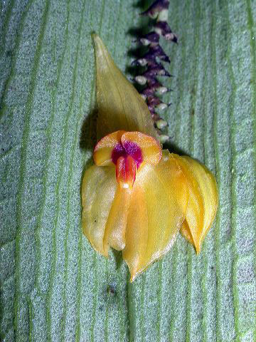 Found in Ecuador at elevations of 2600 to 2800 meters as a small to just medium sized, cold growing epiphyte with stout, erect, ramicauls enveloped by 11 to 18, long-ciliate, lepanthiform sheaths with dilated ostia and carrying a single, erect, thinly coriaceous, longitudinally rugose beneath, ovate, subacute, acuminate rounded below into the contracted petiolate base leaf that blooms in the summer and winter on a slender, congested, distichous, 2" [5 cm] long, racemose, successively many flowered inflorescence arising from behind the leaf