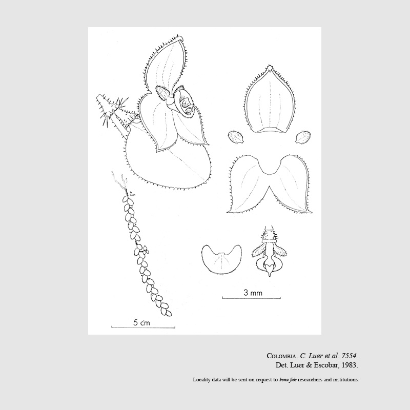 Found in Boyaca department of Colombia at elevations around 2500 meters as a small sized, cold growing epiphyte with a series of prolific, repent ramicauls enveloped by long hispid, lepanthiform sheaths and carrying a single apical, prostrate, coriaceous, elliptical, shortly cilate margin, rounded into the petiolate base leaf that blooms in the spring on a .08" [2 mm] long, single flowered inflorescence with a hispid floral bract.