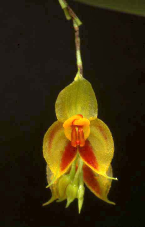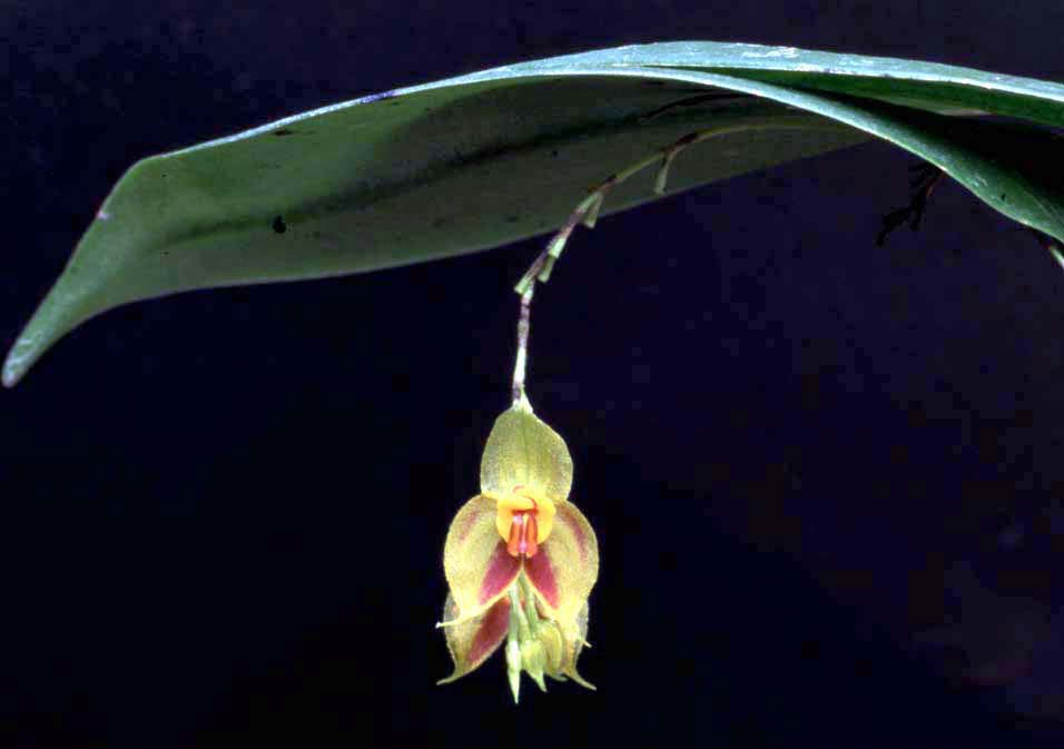 Found in Colombia, Ecuador, Peru and Bolivia in elfin cloud forests at elevations around 2450 to 2800 meters as a small sized, cold growing epiphyte with erect, stout ramicauls enveloped completely by 5 to 9, lepanthiform sheaths with dilated ostia and carrying a single, apical, elliptic to oblong-elliptic, rather abruptly long acuminate and minutely tridenticulate apically, 3 nerved, broadly cuneate below into the short, channeled petiolate base leaf that blooms in the winter and spring on 1 to 2, filiform, arcuate, shorter to equalling the leaf in length, to 4.4" [11 cm] long, successively single, few to many flowered, racemose inflorescence