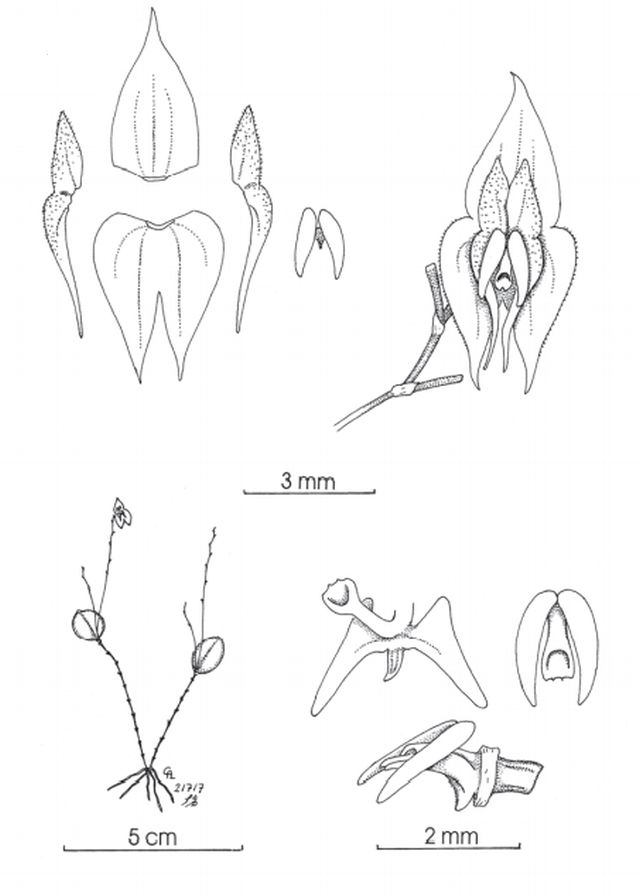 "This delicate little species with nearly circular leaves has a loose, successively flowered raceme with small flowers with sharply acute sepals. The lobes of the petals are acute, and the long, attenuated lower lobes hang downward, nearly as long as the lateral sepals. The blades of the lip are narrowly crescent-shaped. The boat-shaped appendix is pubescent within." Luer & Larsen 2012