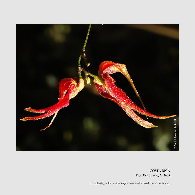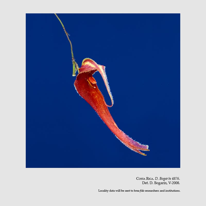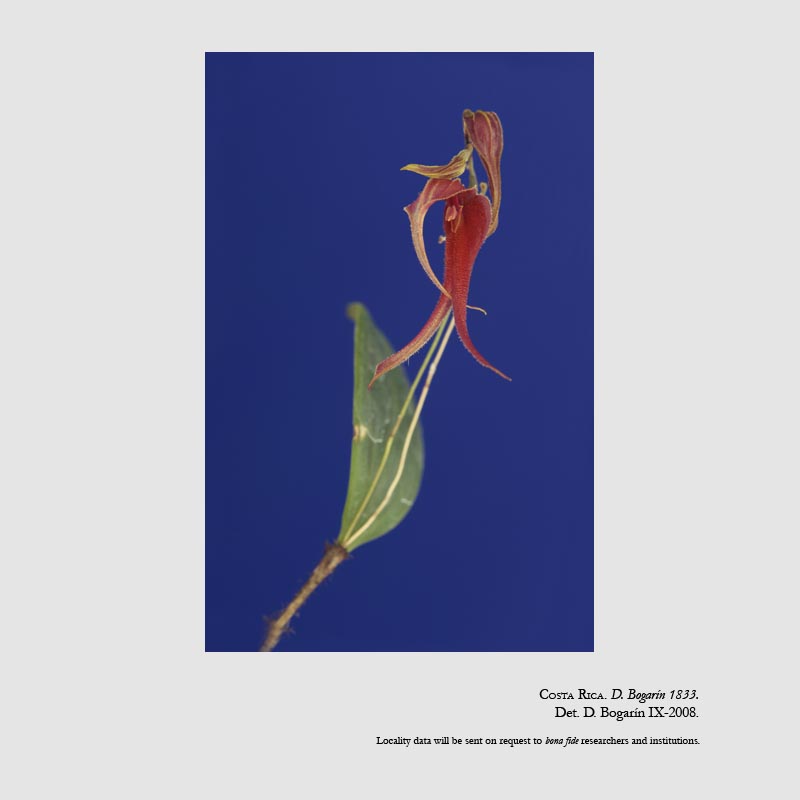 Found in Costa Rica in cloud forests at elevations of 2200 to 2700 meters as a mini-miniature sized, cold growing epiphytic species with erect, slender, ramicauls enveloped by 7 to 11, hairy, lepanthiform sheaths and carrying a single ovate, acute, tridenticulate apically, gradually narrowing below into the abbreviated conduplicate base leaf that blooms in the fall on an erect, to 2.4" [to 6 cm] long, successively single few flowered, racemose inflorescence.