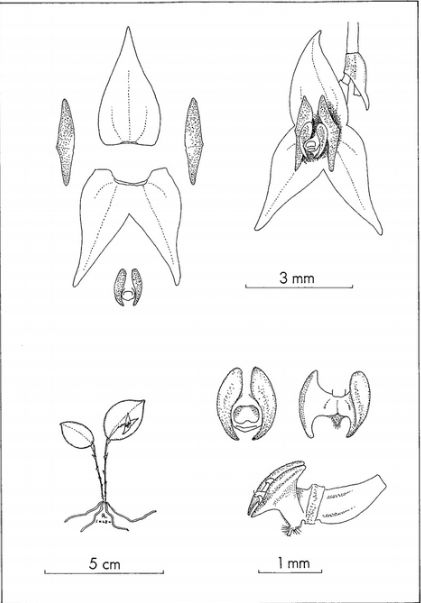 "An ovate leaf with a congested raceme of small reddish flowers borne on top of the elaf. The sepals are ovate, acute and glabrous, the two lobes of the petals are narrowly triangular and pointing in opposite directions, the upper slightly larger than the lower and the lip is bilaminate. The sinus is deep with a long-pubescent appendix." Luer 1990
