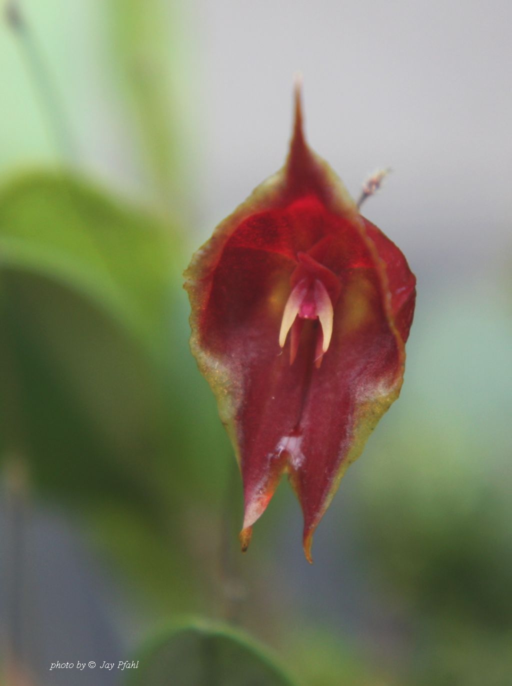 Found in Colombia at elevations of 2600 meters in sub-paramo mist forests as a mini-miniature sized, cold growing epiphyte with horizontal to erect ramicauls enveloped by 3 to 4 lepanthiform sheaths and carrying a single apical, erect, coriaceous, ovate, rounded, gradually narrows below into the base leaf that blooms in the spring on an erect, to ascending, 1 5/8" [4 cm] long, successively, single flowered inflorescence.