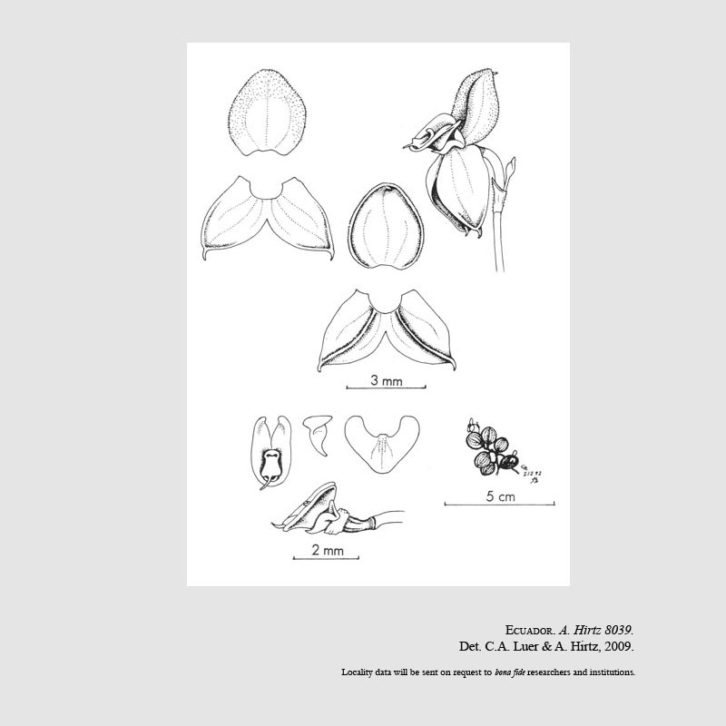 Found in Pichincha Ecuador at elevations around 1500 meters as a mini-miniature sized, cool growing epiphyte with a repent, branching rhizome giving rise to a suberect ramicaul enveloped by 1 to 2, thin, long-ciliate, lepanthiform sheaths and carrying a single, apical, prone, coriaceous, circular, rounded and contracted below into the base leaf that blooms in the summer on an erect, congested, .2 to .24" [5 to 6 mm] long, successively single, 2 to 3 flowered inflorescence.