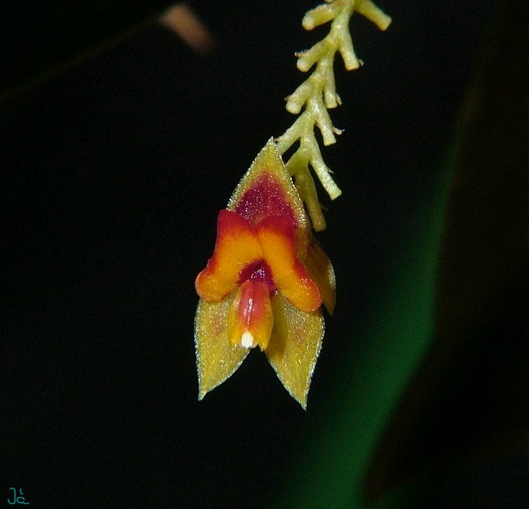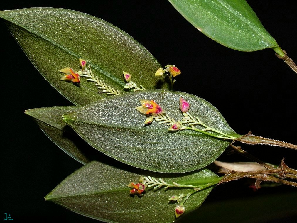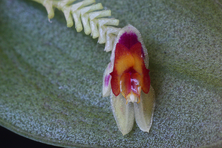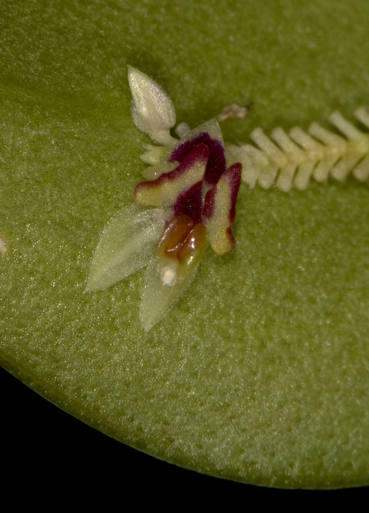 "Distinguished by the ovate, purplish leaves borne by a relatively stout, ciliate, lepanthiform shethed ramicauls and a short, congested raceme borne behind the leaf. The red, green-edged sepals are microscopically denticulate. The orange prtals are oblong with truncate ends. The thin blades of the lip are adherent to each other over the column. The connectives are free from each other, being connate indivdually to the base of the column with the pedunculated appendix between. A similar abscence of a body is seen in L disjuncta." Luer 1996