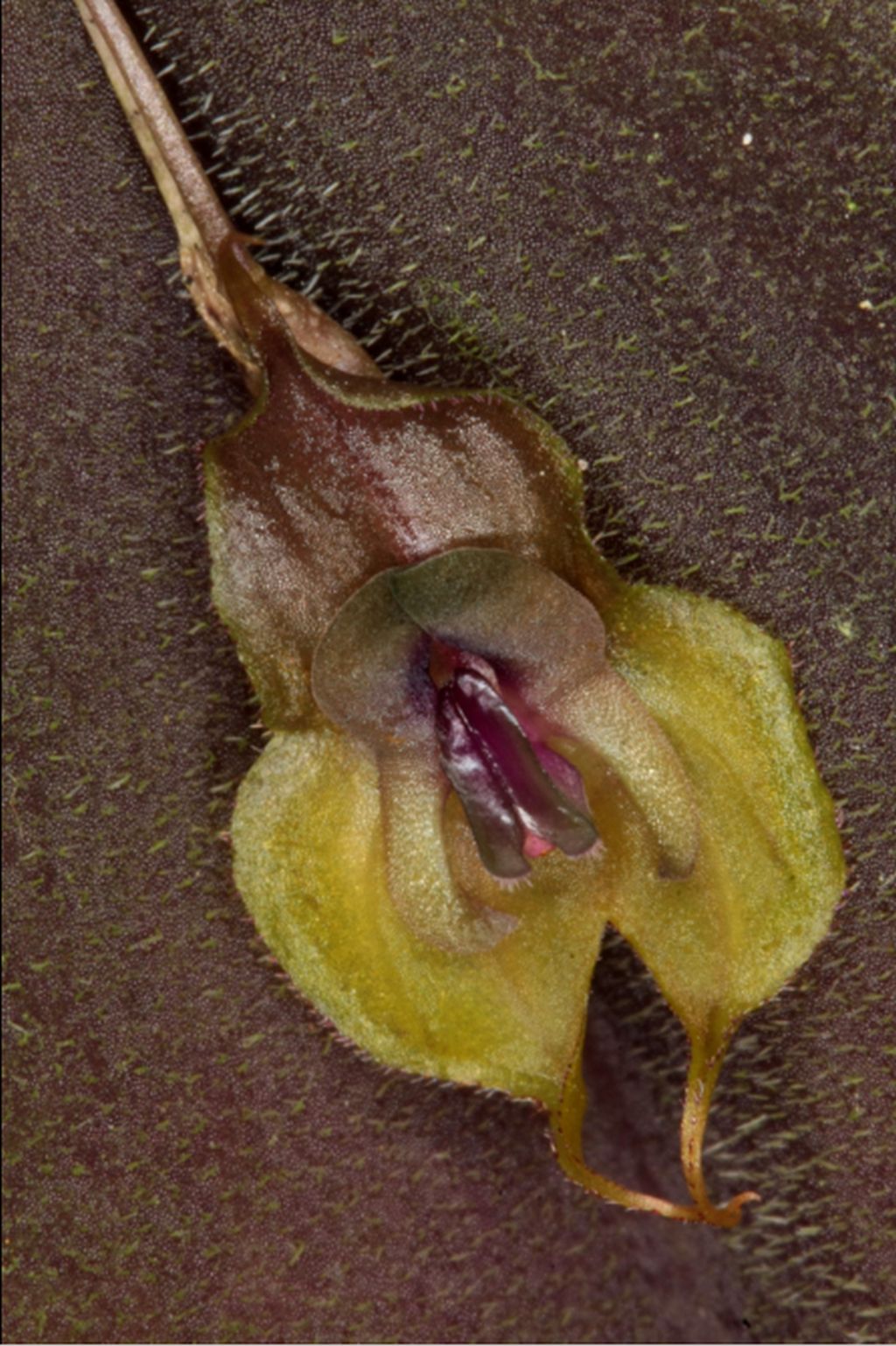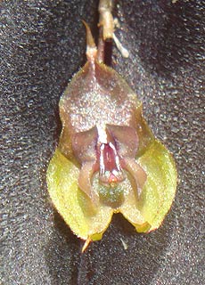 Found in Valle de Cauca department of Colombia in cloud forests at elevations around 2200 meters as a miniature sized, cold growing epiphyte with erect ramicauls enveloped by 5 to 11, lepanthiform sheaths with dilated, ciliate ostia and carrying a single, apical, coriaceous, purple suffused, ovate, acute, acuminate to mucronate apically, cuneate below into the base leaf that blooms in the winter on a slender, congested, secund, 1.2 to 1.4" [3 to 3.2 cm] long including the .4 to .45" [1 to 1.2 cm] long peduncle, successively single, many flowered inflorescence arising on top of the leaf.