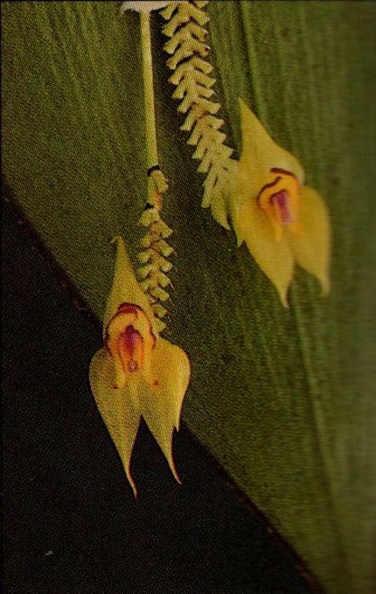 Found in Antioquia, Choco and Risaralda departments of Colombia on the western cordillera in cloud forests as a small sized, cold growing epiphyte at elevations of 2100 to 2400 meters with an erect ramicaul enveloped by 13 to 16, minutely ciliate, lepanthiform sheaths and carrying a single, apical, erect, coriaceous, ovate, acute, abruptly narrows below into the petiolate base leaf that blooms in the spring on more than one, erect, filiform, congested, distichous, 1.6 to 2.8" [4 to 7 cm] long including the .8 to 1.2" [2 to 3 cm] long peduncle, successively single, many flowered inflorescence arising on the back side of the leaf.