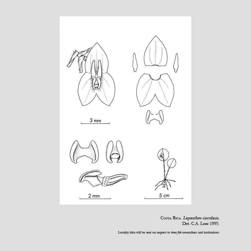 "Characterized buy the little round leaves, and short congested racemes. The sepals are broadly ovate, obtuse and entire. The transverse petals are distinguished by minute lower lobes and .08" [.2 mm] long, and broad. Other species with extremely small lower lobes include L costaricensis, L reflexa and L subdimidiata. The blades of the lip are oblong with broad connectives and a minute, external appendix." Luer 1995