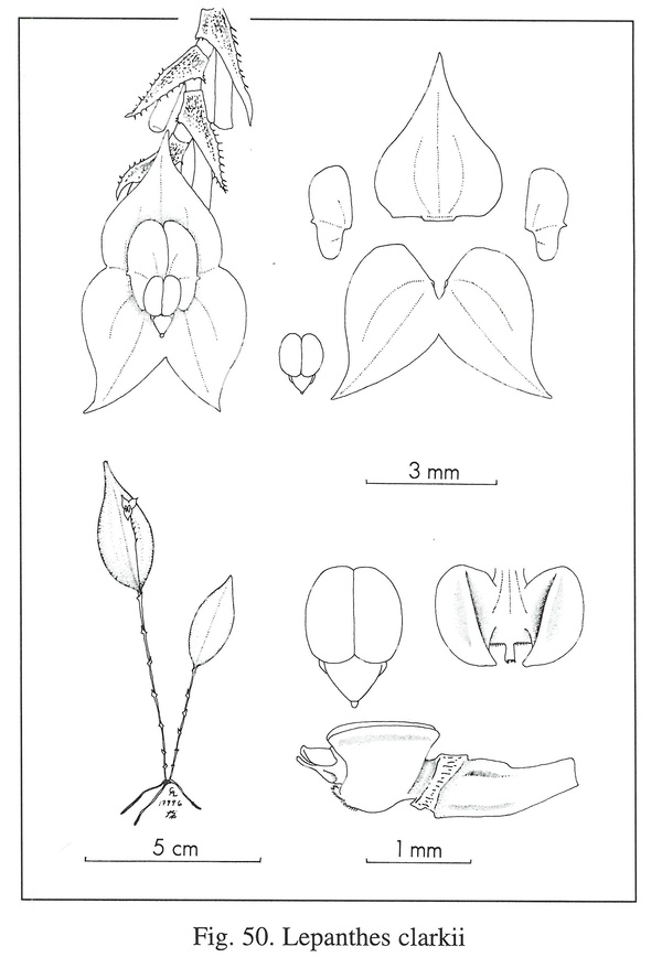 Similar to L ilensis but L clarkii is distinguished by the small habit, long-ciliate sheaths of the ramicauls, elliptic-ovate leaves, a congested raceme shorter than the leaf, broad, acuminate sepals, oblong petals, and a small fleshy lip with the glabrous blades adherent over the column.