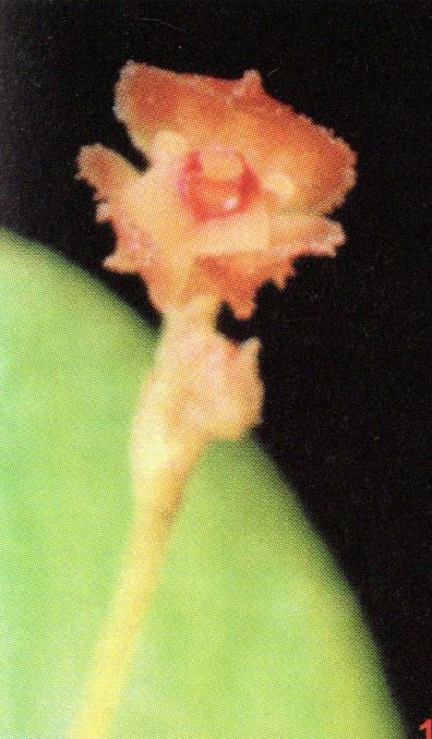 Found in Alta Verapaz department of Guatemala at elevations around 1400 meters as a mini-miniature sized, cool growing epiphyte with erect, thin ramicauls enveloped by 2 to 4, hyaline lepanthiform sheaths with the margins of the brown ostium puberulent and carrying a single, apical, orbicular, green colored, tridentate apically leaf that blooms in the late winter on an erect, on the back side of the leaf, .532" [1.33 cm] long, longer than the leaf, successively single, few flowered inflorescence with brown ciliate floral bracts.