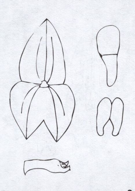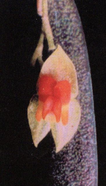 Found in Guatemala near Coban at elevations around 1400 meters as a mini-miniature sized, cool growing epiphyte with erect, filiform ramicauls enveloped by brown lepanthiform sheaths with the margins of the ostium glandular pubescent and carrying a single, apical, elliptic-oblong, purple colored, flat with a prominent midvein, tridentate apically leaf that blooms in the late summer on 1 to 2, erect, .6 to .8" [1.5 to 2 cm] long, subcongested, successively single, few flowered inflorescence with papery, coffee colored, glabrous floral bracts.