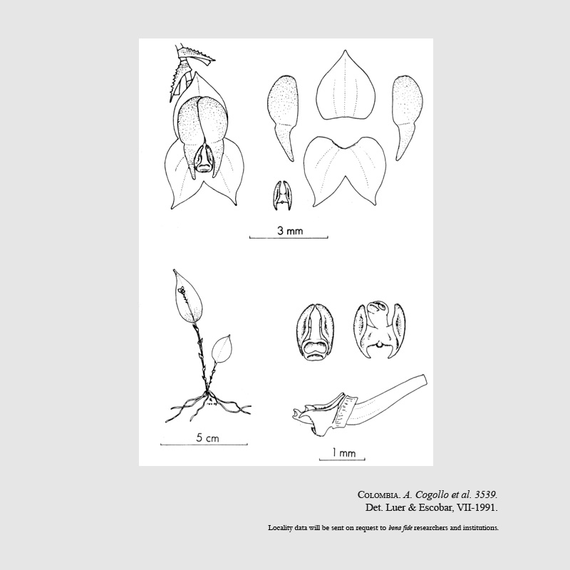 References W3 Tropicos, Kew Monocot list , IPNI ; * Orquideología 18(1): 34,36 Luer & Escobar 1991 drawing fide; Icones Pleurothallidinarum Vol XXXII Luer 2012 Luer drawing fide; Orchids A Colombian Treasure Vol 3 Ortiz & Uribe 2019 drawing/photo fide;