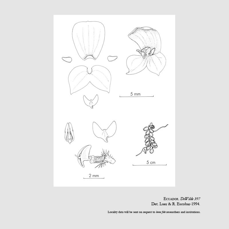 Found in Risaralda department of Colombia in remnant forests at elevations around 2000 meters as a mini-miniature to small sized, cool to cold growing epiphyte with a pendant, slender, branching rhizome giving rise to slender ramicauls enveloped by a single, long-ciliate, lepanthiform sheath and carrying a single, apical, pendant, lentiform, coriaceous, long-pubescent, broadly elliptical, obtuse, 3 veined, contracted below into the petiolate base leaf that blooms in the winter on a, racemose, .04" [1 mm] long, single flowered inflorescence arising from near the apex of hte ramicaul with a long ciliate floral bract.