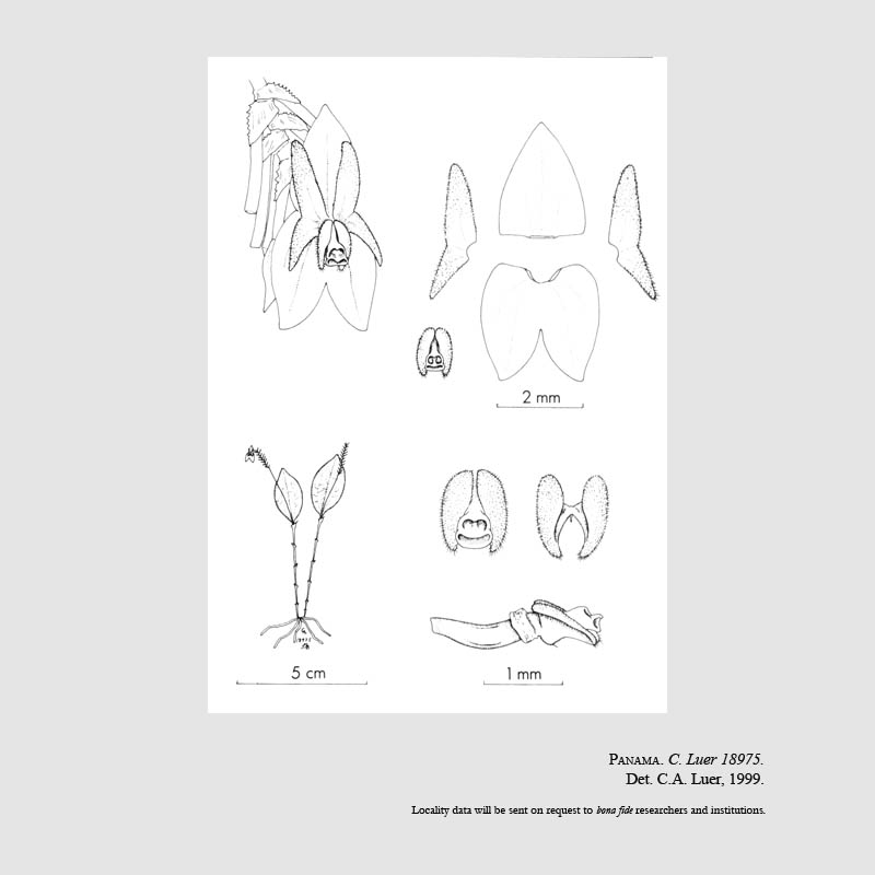 Found in Panama at elevations around 900 meters as a mini-miniature sized, warm growing epiphyte with erect, slender ramicauls enveloped by 3 to 6, microscopically scabrous, dark brown, lepanthiform sheaths and carrying a single, erect, coriaceous, elliptical, subacute, reticulated, broadly cuneate below into the petiolate base leaf that blooms in the fall on a filiform, racemose, congested, distichous, to 1.6" [4 cm] long, successively many flowered inflorescence arising behind the leaf.