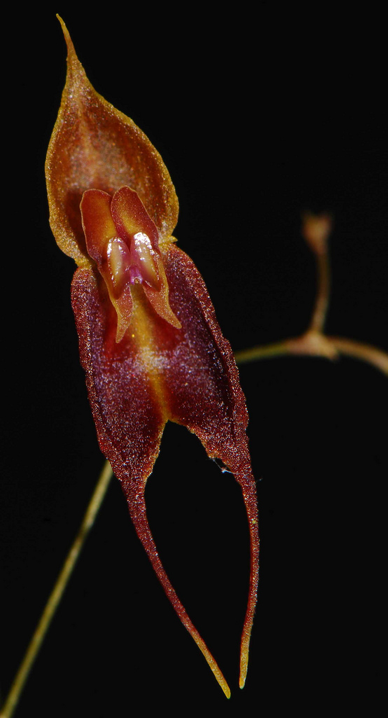 Found in northwestern Ecuador in cloud forests at elevations of 2000 to 2500 meters as a mini-miniature sized, cold growing epiphyte with erect, slender ramicauls enveloped by 5 to 6 close, minutely ciliate lepanthiform sheaths and carrying a single, apical, coriaceous, elliptical, obtuse, the rounded base cuneate into the petiolate base leaf that blooms in the winter and spring on a loose, flexuous, 2.4" [6 cm] long, successively single, several flowered inflorescence.