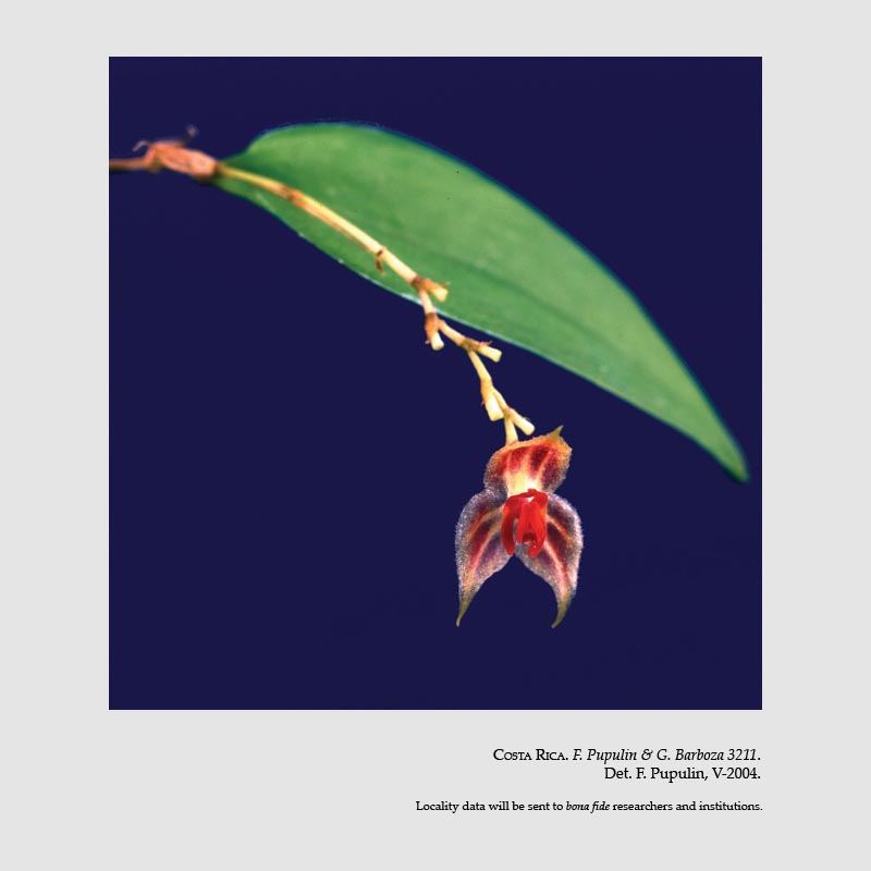 Found in Costa Rica in lower montane cloud forests at elevations around 1500 meters as a mini-miniature sized, pendant, cool growing epiphtye with pendant ramicauls enveloped completely by 3 to 6, lepanthiform sheaths and carrying a single, apical, erect, narrowly elliptical, acute, gradually narrows below into the cuneate base leaf that blooms in the spring on a short successively single, few flowered inflorescence holding the flower on the front of the leaf.