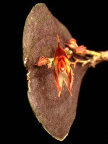 Found in Bolivia in cloud forests at elevations around 2400 to 2700 meters as a mini-miniature sized, cold growing epiphyte with erect, slender ramicauls enveloped by 4 to 7, ciliate, lepanthiform sheaths with dilated ostia and carrying a single, apical, erect, coriaceous, narrowly elliptic, acute, cuneate below into the petiolate base leaf that blooms in the summer on 1 to few, 1/2" [1.25 cm] long, successively single, few flowered, racemose inflorescence