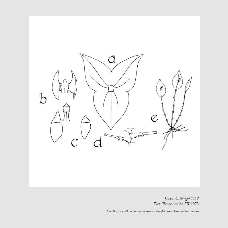 Found in Cuba at elevations around 400 to 600 meters as a small sized, hot to warm growing epiphyte with slender, erect, ramicauls enveloped by up to 8, cornucopiate, acuminate, lepanthiform sheaths with short hispid ostia and carrying a single, apical, erect, coriaceous, broadly ovate, acute to shortly acuminate, tridenticulate, cuneate below into the petiolate base leaf that blooms on a distally distichous, 1/2" [1.2 cm] long, densely successively single, several flowered inflorescence that is much shorter than the leaf with dilate, acute, hispid floral bracts.