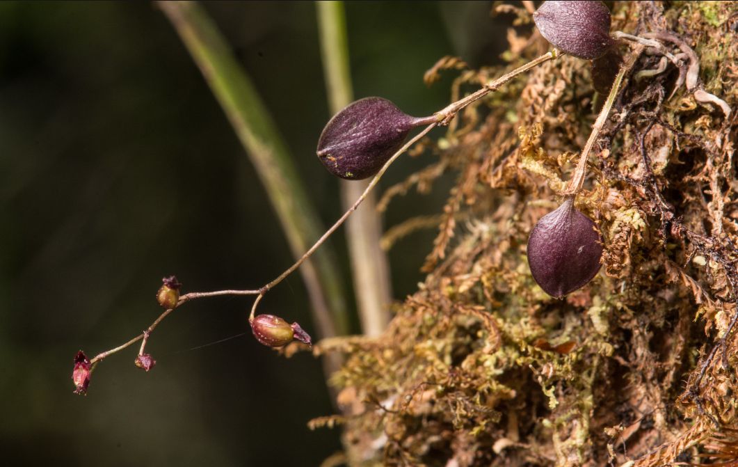Found in Norte de Santander and Narino departments of Colombia in cloud forests at elevations around 2850 meters as a small sized, cold growing epiphyte with slender, erect ramicauls enveloped by 5 to 6, minutely ciliate, lepanthiform sheaths and carrying a single, apical, erect, thickly coriaceous, broadly elliptical to subcircular, obtuse, contracted below into the petiolate base leaf that blooms in the later spring on a loose, distichous, 1 to 1.4" [2.5 to 3.2 cm] long including the .4" [1 cm] long peduncle, successively single, several flowered inflorescence with echinate floral bracts and carrying purple, cleistogamus flowers.