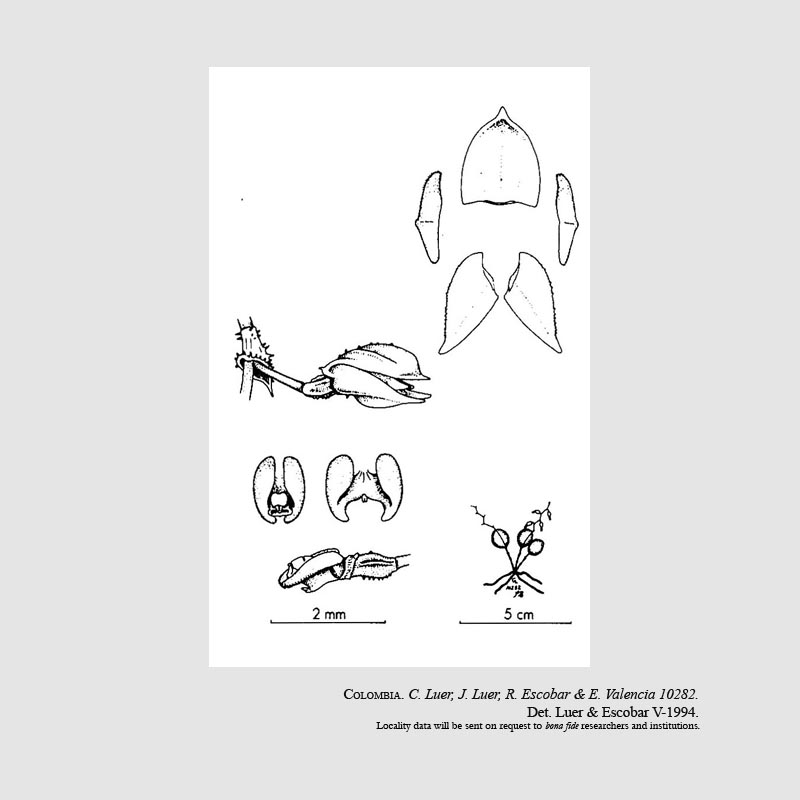 References W3 Tropicos, Kew Monocot list , IPNI ; *Orquideología Vol 19 #2 pg 84-90. Luer & Escobar 1994 Drawing fide; Orchids A Colombian Treasure Vol 3 Ortiz & Uribe 2019 photo fide;