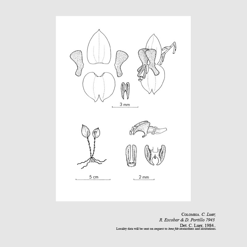 References W3 Tropicos, Kew Monocot list , IPNI ; *Orquideología 16(2): 135. Luer & Escobar 1984 Drawing fide; Icones Pleurothallidinarum Vol XXXII Luer 2012 Luer drawing fide; Orchids A Colombian Treasure Vol 3 Ortiz & Uribe 2019 drawing fide;