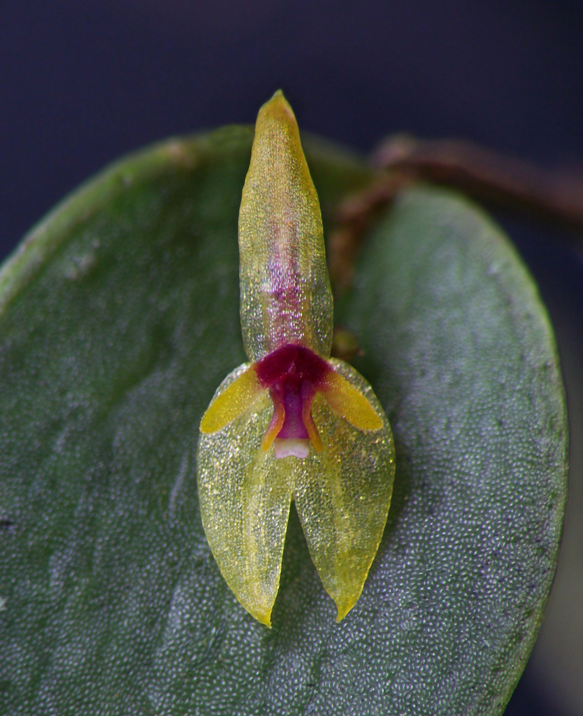 Found in Costa Rica at elevations around 500 meters as a mini-miniature sized, hot to warm growing epiphyte with erect, slender ramicauls enveloped by 4 to 5, minutely ciliate, close fitting, lepanthiform sheaths and carrying a single, erect, coriaceous, broadly elliptical, subacute to obtuse, cuneate below into the petiolate base leaf that blooms in the winter on a filiform, racemose, congested, distichous, to .36" [9 mm] long, successively several flowered inflorescence arising from behind the leaf with muriculate floral bracts.
