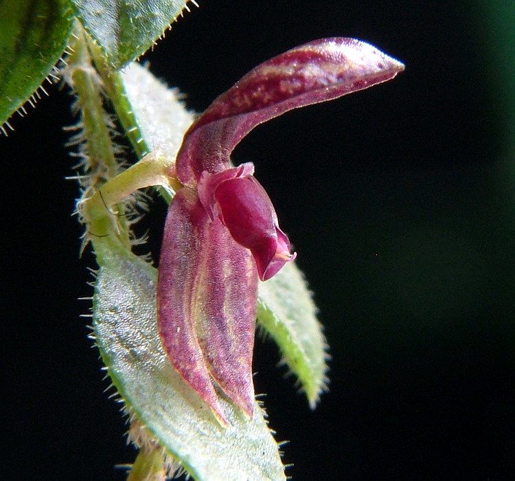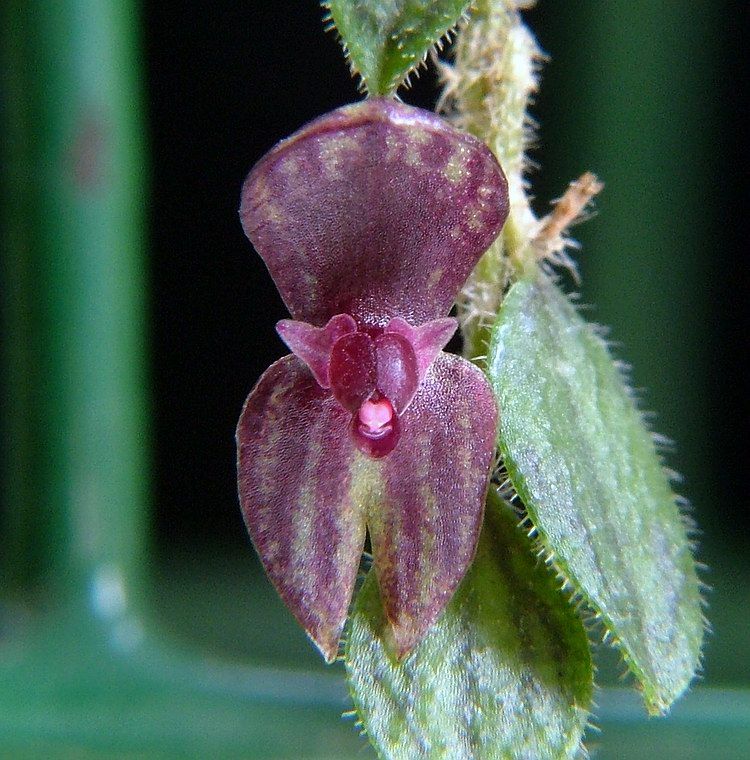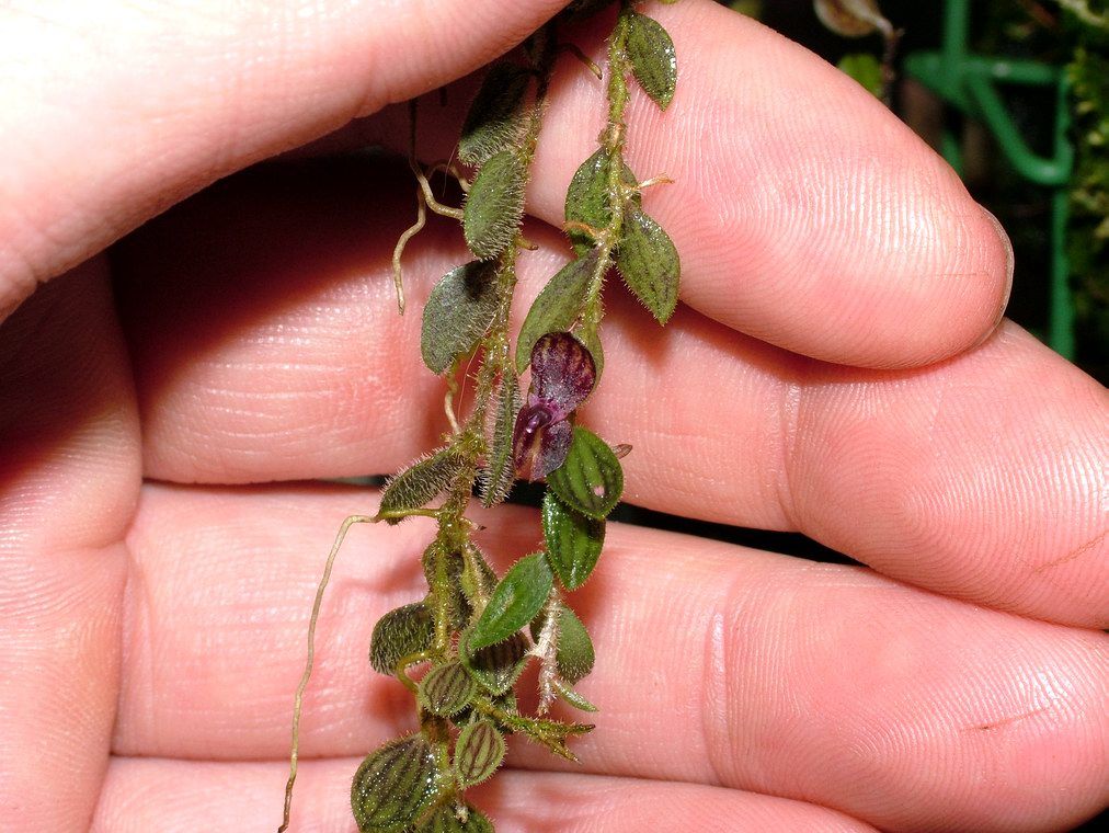 Found in Antioquia, Boyaca and Norte de Santander departments of Colombia in scrub cloud forests at elevations around 1950 to 2600 meters as a mini-miniature sized, cold growing epiphyte with a pendant, long-repent chain of abbreviated ramicauls enveloped by a long ciliate, lepanthiform sheath and carrying a single, apical, descending, coriaceous, ciliate, sparsely pubescent, broadly elliptical, obtuse, 3 to 5 veined, cuneate into the petiolate base leaf that blooms on a slender, upcurved, .08" [2mm] long, single flowered inflorescence with an apiculate floral bract.