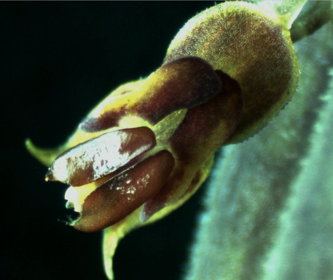 Found in Amazonas department of Peru without elevational data as a mini-mininature sized epiphyte with suberect ramicauls enveloped by 6 to 13, lepanthiform sheaths with dilated, ciliate ostia and carrying a single, apical, suberect to spreading, coriaceous, elliptical, slightly acuminate, acute, reticulate, convex, sulcate centrally, cuneate below into the petiolate base leaf that blooms in the late spring on a filiform, congested, 1.28" to 2.08" [3.2 to 5.2 cm] long, including the .08" [2 mm] long peduncle, successively single, many flowered inflorescence arising along the sulcus of the dorsum of the leaf.