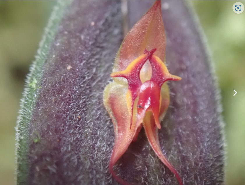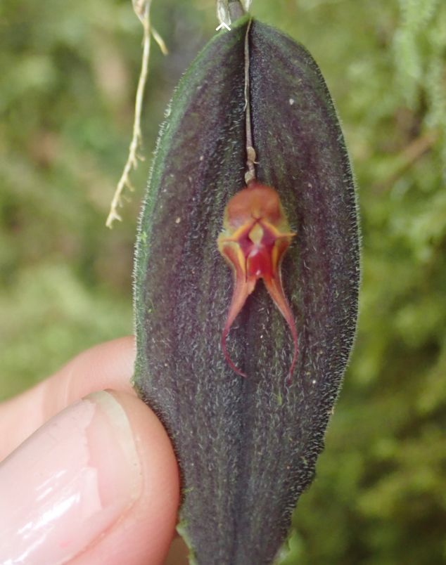 Found in Esmeraldas province of Ecuador at elevations around 1800 meters as a miniature sized, cool growing, caespitose epiphyte with erect, slender ramicauls enveloped by 15 dilated, acuminate, ciliate lepanthiform sheaths and carrying a single, apical, erect, coriaceous, elliptical-ovate, acute, acuminate, contracted below into the petiolate base leaf that blooms in the fall on a, arising from the apex of the ramicaul, peduncle 1.2" [3 cm] long, 2" [5 cm] long overall, congested, successively single, many flowered inflorescence with shorter than the ovary floral bracts with flowers with transluscent yellow sepals, dark red with an oranger border petals and a dark orange lip.