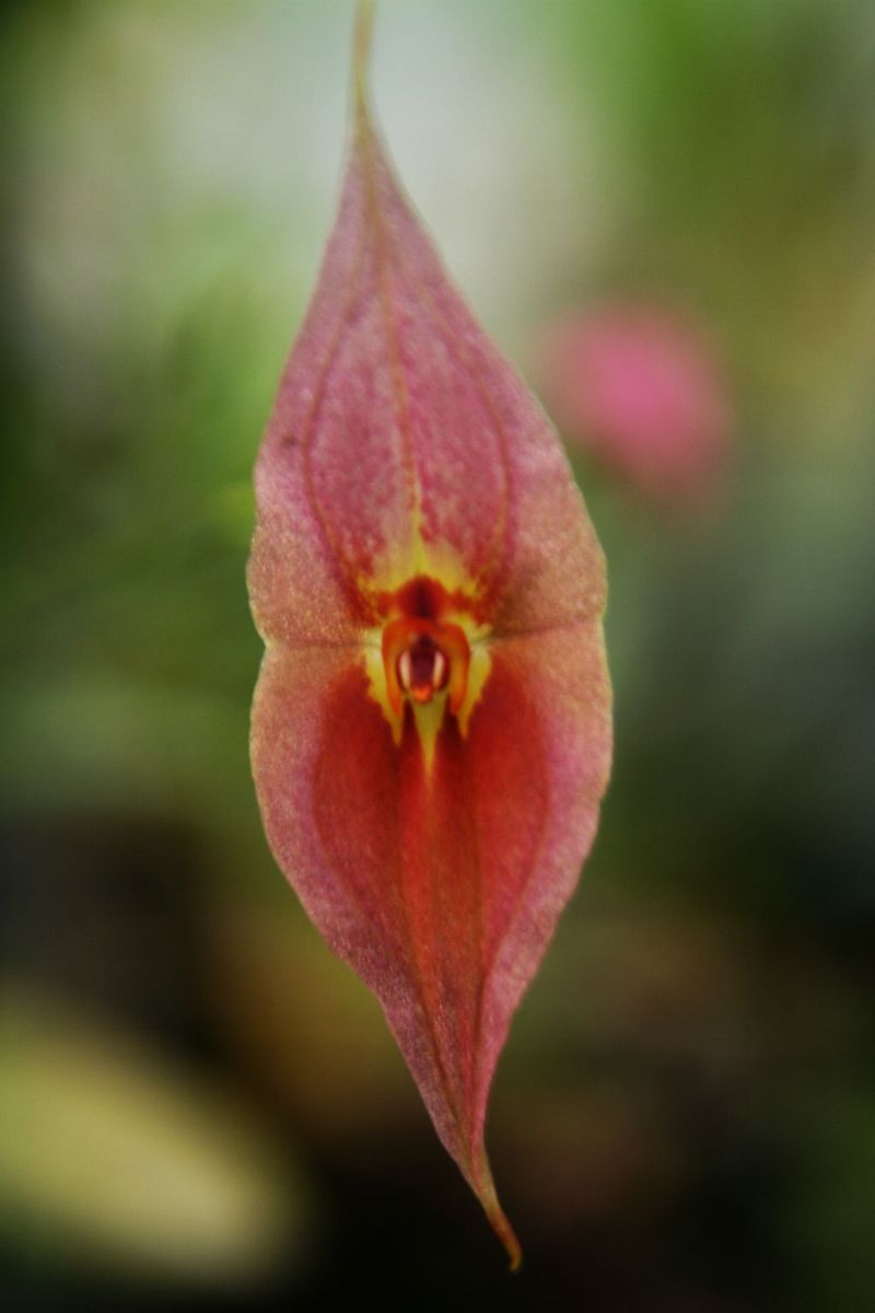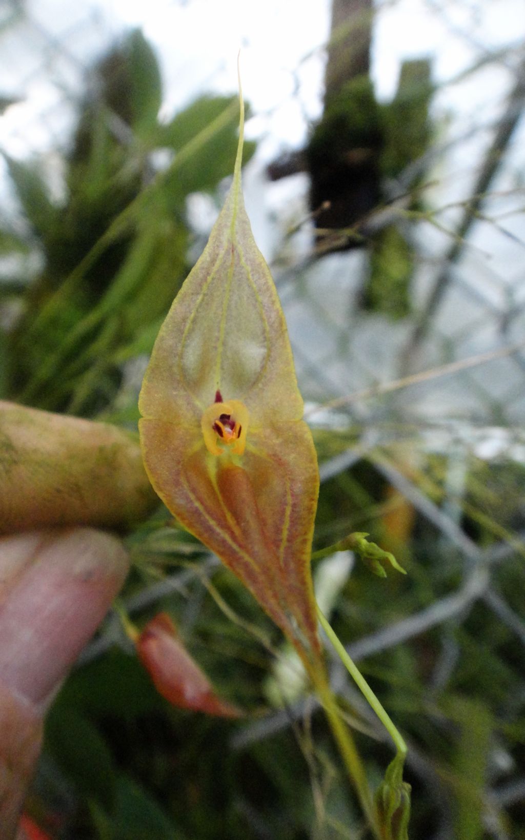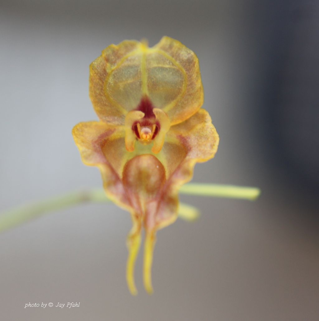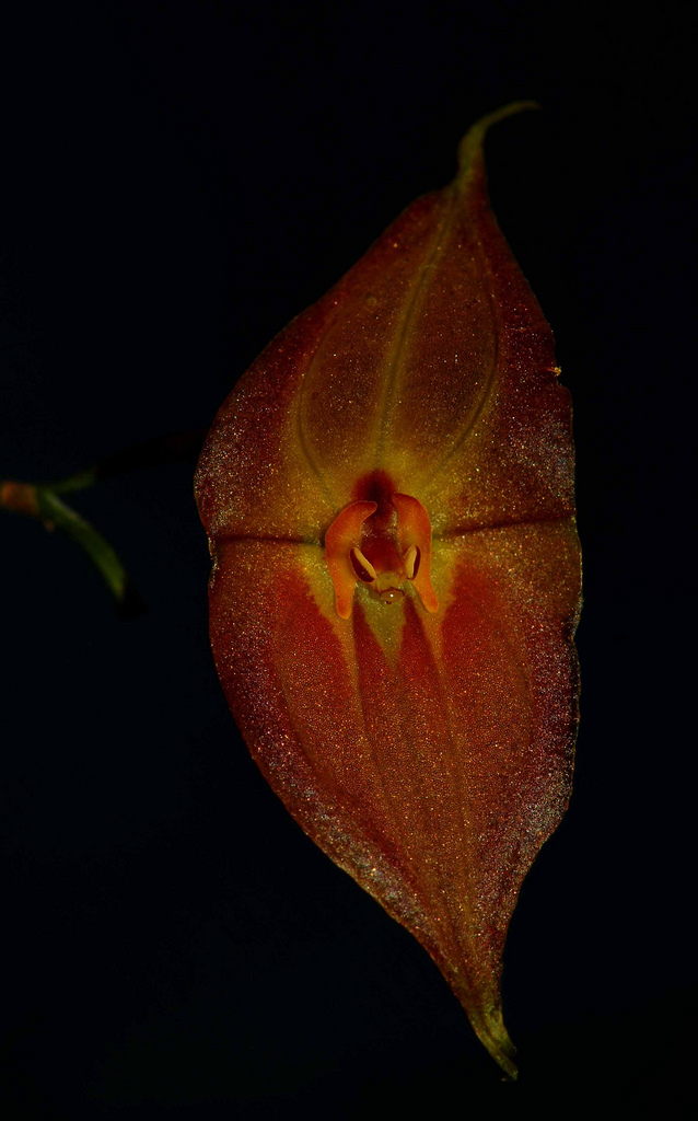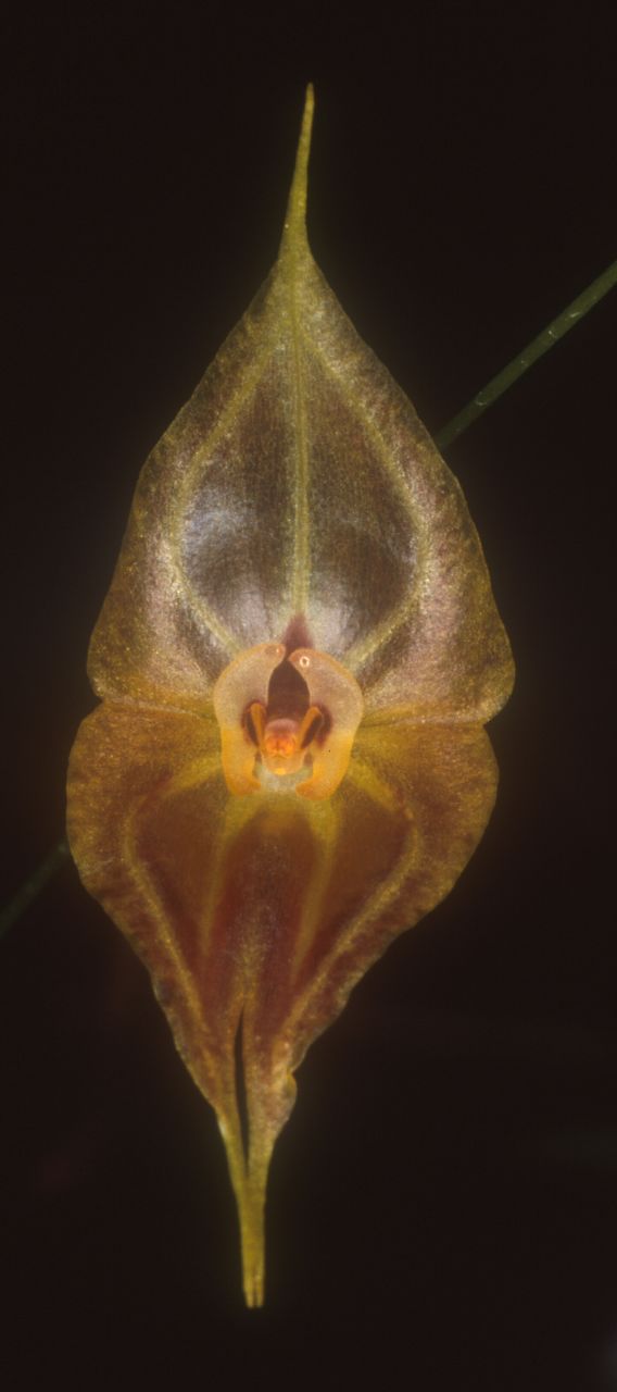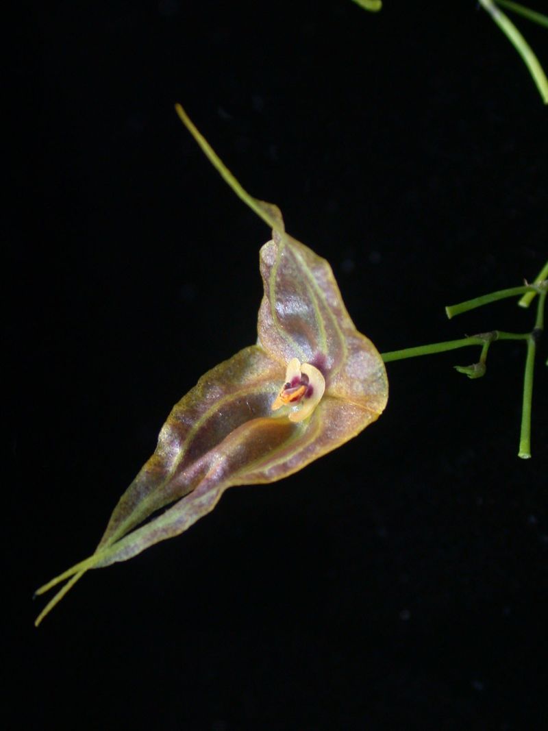 Found in Ecuador and Peru in cloud forests at elevations around 1700 to 2400 meters as a mini-miniature sized, cool to cold growing epiphyte with slender to comparatively stout, erect ramicauls enveloped basally by 3 to 6, microscopically scabrous, lepanthiform sheaths carrying a single, apical, coriaceous, narrowly oblong, subacute to obtuse, narrowly cuneate below into the petiolate base leaf that blooms in the spring on a progressively lengthening, subflexuous, 13.2" [33 cm] long, loosely 1 to 3, simultaneously flowered, racemose inflorescence with very large flowers for the genus.