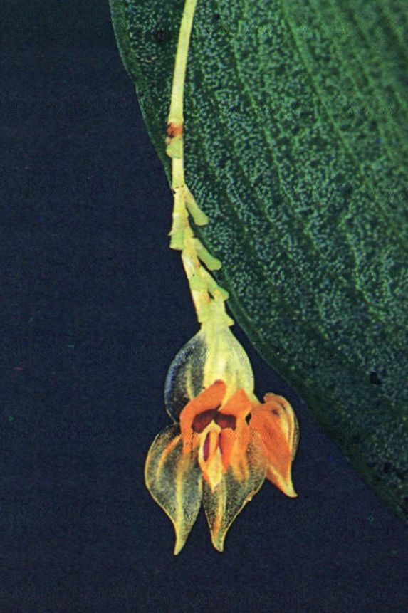 Found in Antioquia department of Colombia in cloud forests at elevations of 2400 to 2700 meters as a small sized, cold growing epiphyte with slender, erect ramicauls enveloped by 10 to 14, microscopically ciliate, lepanthiform sheaths and carrying a single, apical, erect, coriaceous, broadly elliptical, obtuse, abruptly contracted into a subulate apical portion, rounded and contracted into the petiolate base leaf that blooms in the winter, late spring and summer on a filiform, congested, distichous, 1.48 to 1.62" [3.7 to 4.5 cm] long, including the .88 to 1.2" [2.2 to 3 cm] long peduncle, successively single, few flowered inflorescence with oblique floral bracts.
