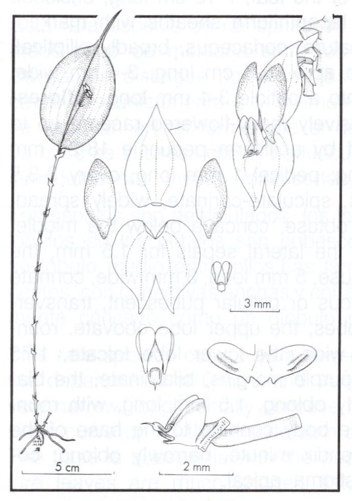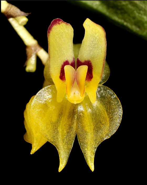 "Distinguished by the thin, more or less wrinkled leaf with a long-acuminate apex from an obtuse blade. The medium sized flowers are borne singly in a congested raceme beneath the leaf. The sepals are lightly acuminate, the petals are trnasverse with th triangular lower lobe much smaller than the oblong upper lobe. The lip is most distinctive with narrow blade-like margins of erect, oblique, oblong connnectives." Luer & Escober 1997
