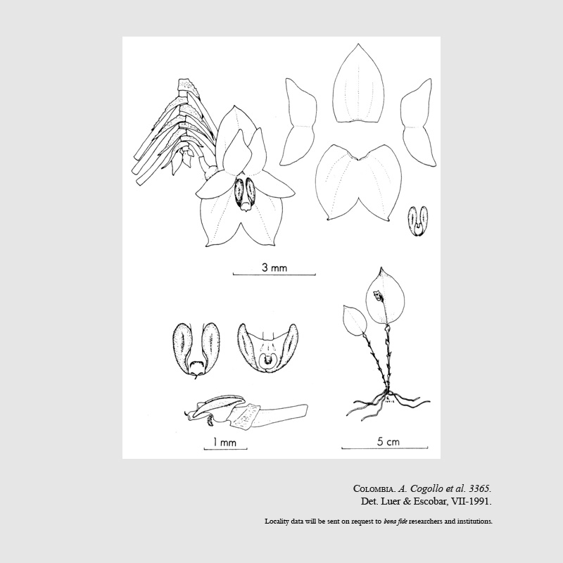 References W3 Tropicos, Kew Monocot list , IPNI ; * Orquideología 18(1): 40–42 Luer & Escobar 1991 drawing fide; Icones Pleurothallidinarum Vol XXXII Luer 2012 drawing fide; Orchids A Colombian Treasure Vol 3 Ortiz & Uribe 2019 drawing fide;