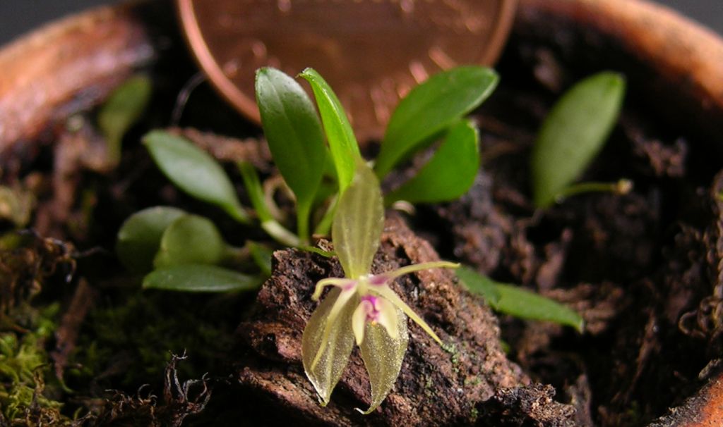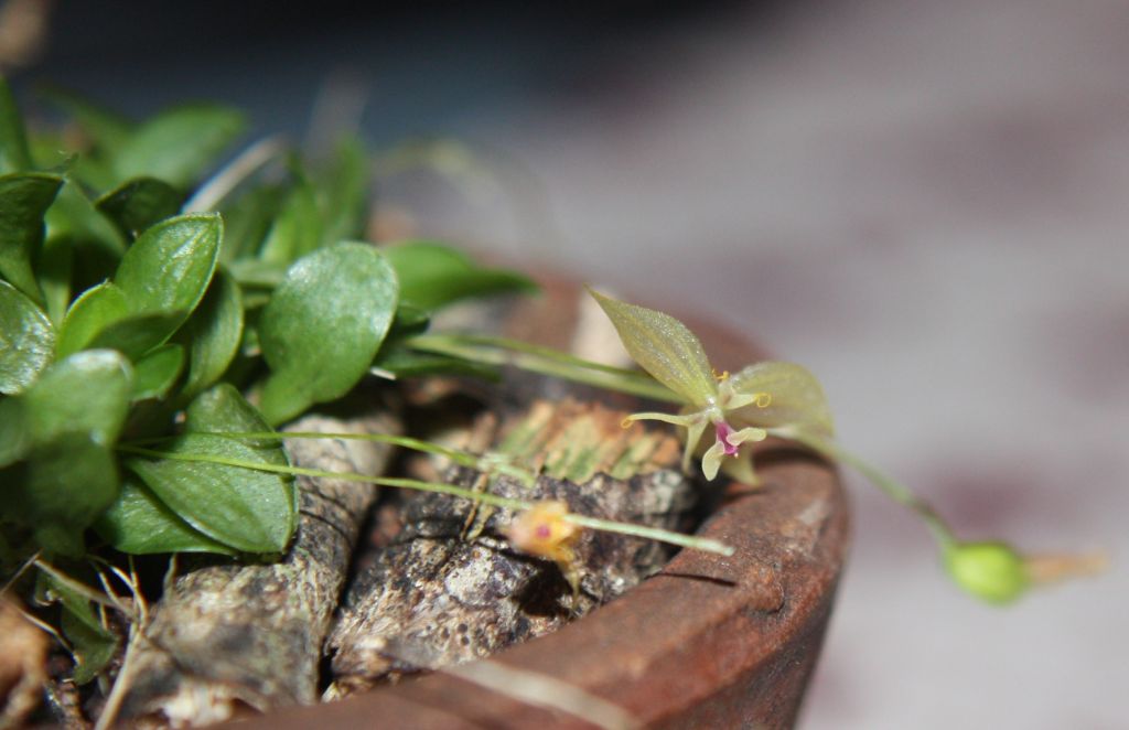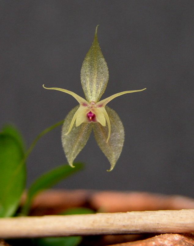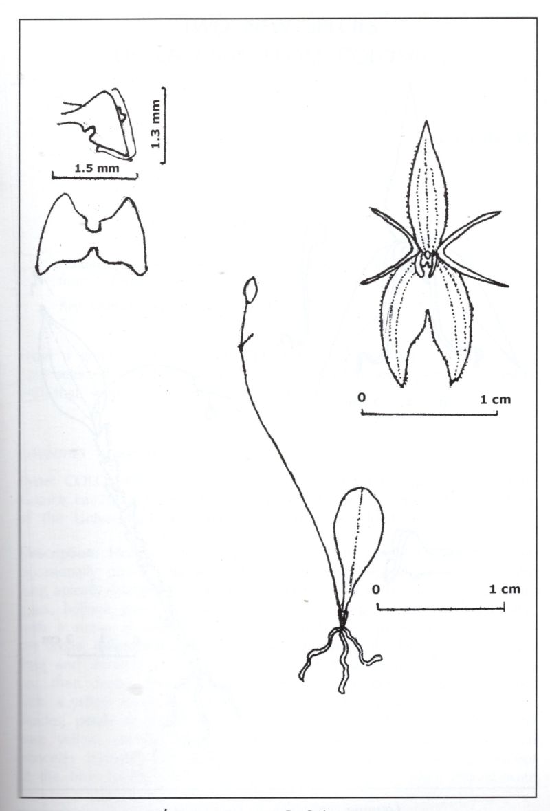 Found as a mini-miniature sized, cold growing epiphyte in eastern Cundinamarca department of Colombia in cloud forests at elevations around 2600 meters in oak forest with slender, erect, slender ramicauls enveloped by 2 to 3, glabrous, lepanthiform sheaths carrying a single, apical, erect, coriaceous, obovate, rounded apically, acuminate and narrowly cuneate below into the petiolate base leaf that blooms in the late spring on an erect, capillary, .8 to 1" [2 to 2.5 cm] long, distantly, successively single, few flowered inflorescence