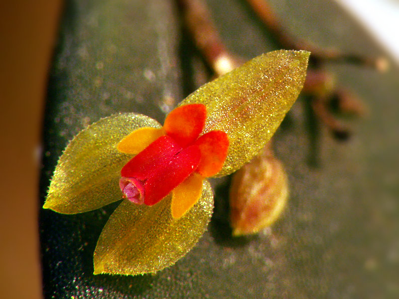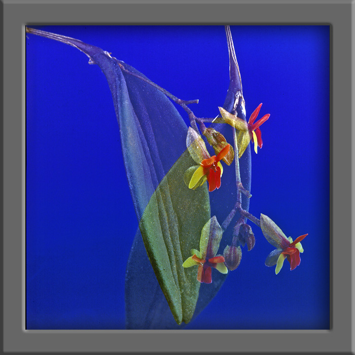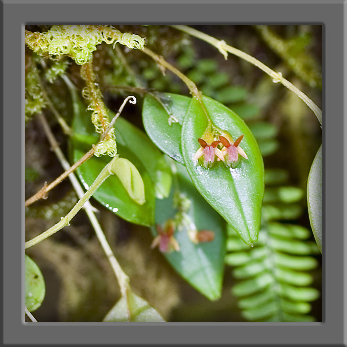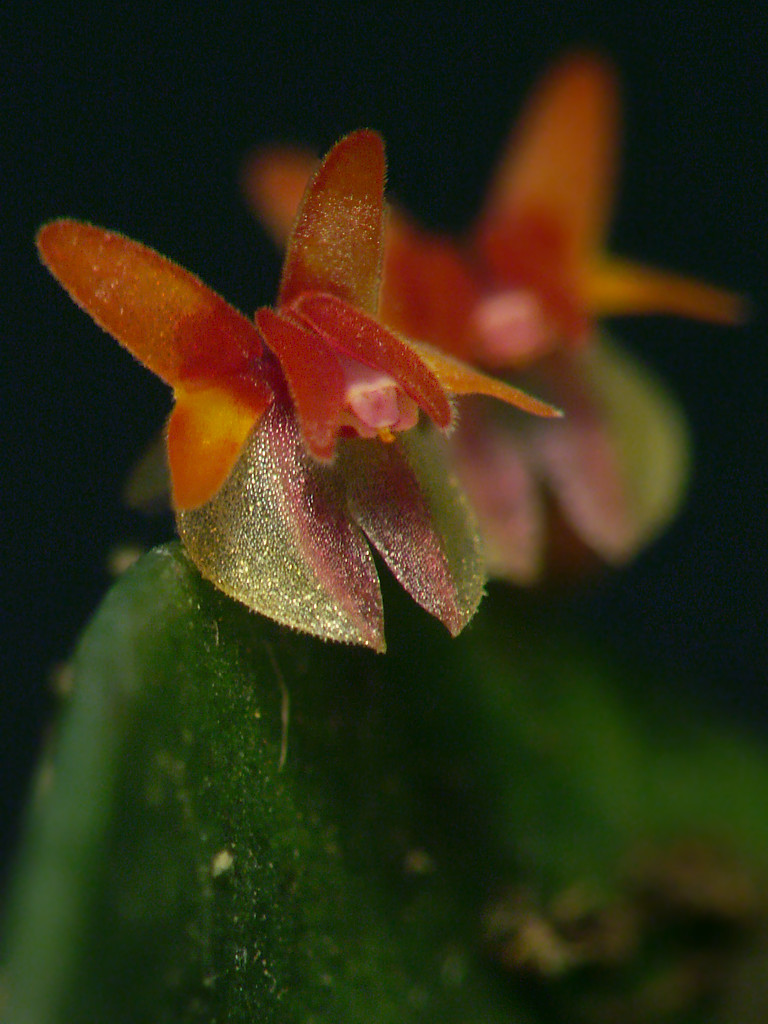 Found in Costa Rica in premontane rain forest to cloud forest and disturbed primary forests at elevations of 1800 to 2580 meters as a mini-miniature sized, cool to cold growing growing epiphyte with erect, slender ramicauls enveloped by 3 to 6, lepanthiform sheaths and carrying a single, apical, thick, elliptic, suffused with purple, minutely tridentate apically, cuneate at the base leaf that blooms on 1 to 2, behind the leaf, short to .15" [3.5 mm] long, successively single, few flowered inflorescence.