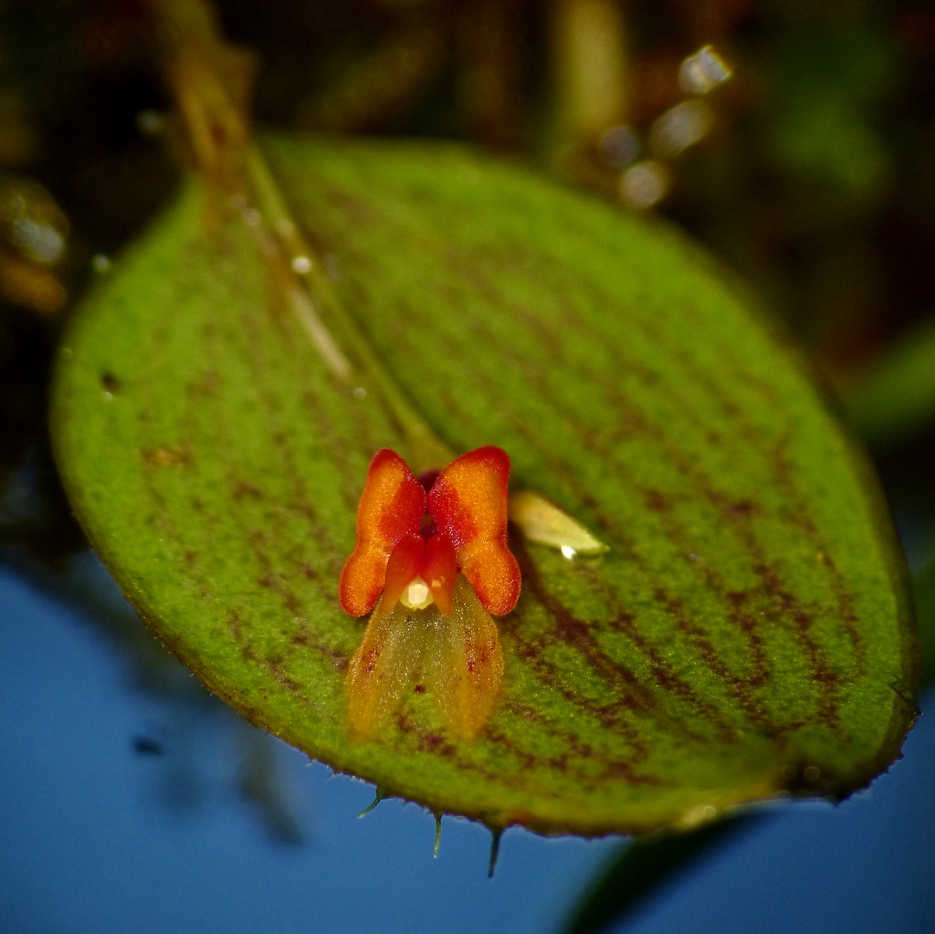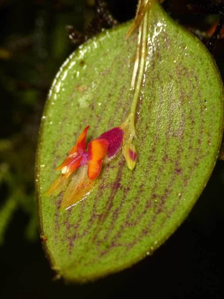 Found in southern Ecuador in wet and cloud forests on the eastern slopes at elevations of 1000 to 2400 meters as a mini-miniature sized, warm to cool growing epiphyte with erect, slender ramicauls enveloped by 6 to 13 close, minutely ciliate lepanthiform sheaths and carrying a single, apical, coriaceous, reticulated with purple beneath, ovate, acute to shortly acuminate, the rounded base abruptly contracted into the petiolate base leaf that blooms in the winter and spring on a congested, distichous, 3/4" [2.2 cm] long, successively single, several flowered inflorescence arising on the back of the leaf.