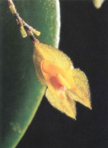 Found in Chiapas state of Mexico and Guatemala on thin branches of small trees within cloud forests at elevations around 2133 meters as mini-miniature sized, cold growing epiphyte with erect, rigid ramicauls enveloped by 4 to 6 lepanthiform sheaths and carrying a single, apical, erect, thickly coriaceous, ovate, acute, cuneate below into the petiolate base leaf that blooms in the later summer on 1 to 2, only one per bloom season, distichous, arising on the back of the leaf, 1.12” [2.8 cm] long, congested, successively single, several flowered inflorescence.