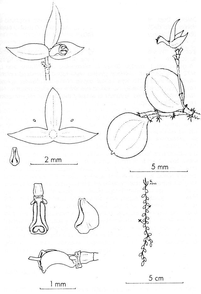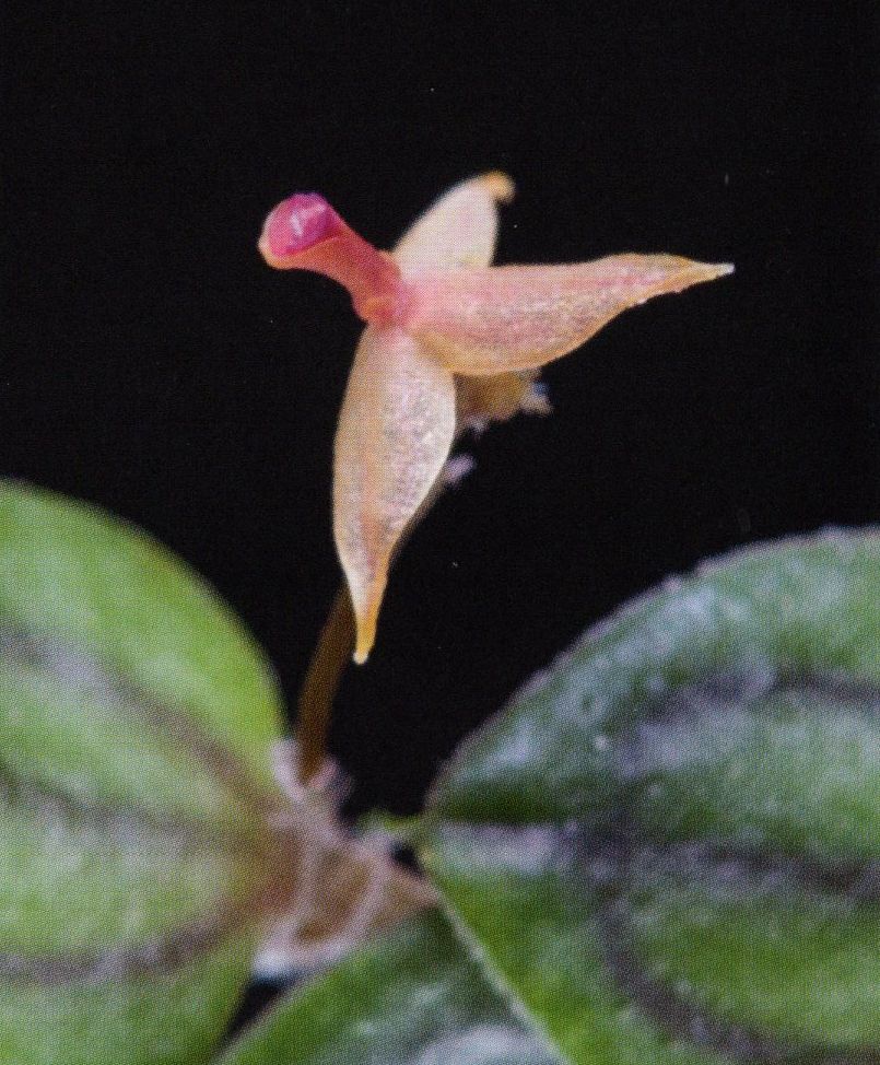 Found in Norte de Santander department of Colombia in cloud forests at elevations around 2150 meters as a mini-miniature sized, cold growing epiphyte with a pendant rhizome giving rise to erect ramicaul enveloped by a single, long-ciliate lepanthiform sheath and carrying a single, pendant, coriaceous, glabrous, widely ovate, 3 veined, obtuse and rounded below into the base leaf that blooms in the spring on a .2 to .4" [.5 to 1 cm] long, racemose, successively single, 2 to 5 flowered inflorescence arising from near the apex of the ramicaul.