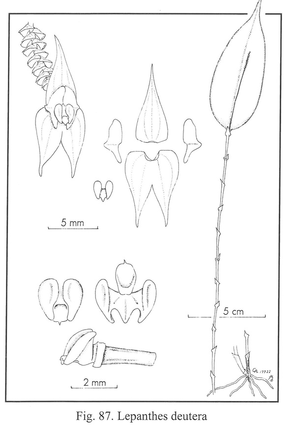 "This large species, known only from one collection in the Western Cordillera of Colombia, is vegetatively similar to Lepanthes cingens . It is distinguished from the latter by narrowly triangular, acute, slightly acuminate sepals. The lateral sepals of L. cingens are ovate and terminate in a broad, subacute tip. The petals are similar. The blades of the lip of L. cingens are deeply concave from beneath, the two convex blades resembling a bivalved mollusk surrounding the column. The blades of the lip of L. deutera are merely ovate and slightly concave centrally, and the appendix is reduced to a triangular membrane resting beneath the column." Luer 2009