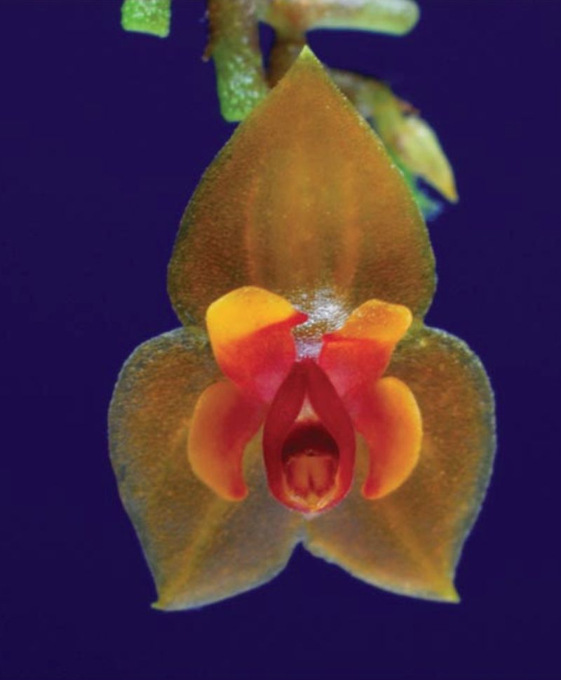It is similar to L. viridis but differs in the smaller leaves up to 1.6" [4 cm] long (vs. longer, to 2.4" [6 cm ] long), smaller flowers to .228 [5.7 mm] in diameter (vs. to .048" [12 mm]), petals glabrous-minutely pubescent (vs. ciliate-hispid), the lower lobe ovate, falcate, shorter than the lobes of the lip (vs. lanceolate, subfalcate, as long as the lobes of the lip), both lobes yellow with red-orange and scarlet (vs. green with red at base) the lip scarlet, apically yellowish (vs. green with dark red at the base of each lobe), the appendix oblong (vs. rounded). It is also similar to L. ovalis but differs in the pendent plants (vs. erect to suberect), smaller mature leaves 1.6 x .6" [4 × 1.5 cm] (vs. 2.4 x .92" [6 × 2.3 cm]), ramicauls with ciliate sheaths and ostia (vs. minutely ciliate-scabrous), the petals glabrous (vs. the upper lobe glabrous, the lower minutely pubescent), the upper lobe oblong, apically rounded (vs. suborbicular), lower lobe of the petals lunate, strongly falcate (vs. narrowly triangular, subfalcate), the color of flowers, the sepals orange (vs. yellow), the lower lobe of petals basally scarlet with the apex yellow-orange (vs. yellow-orange, without the scarlet stain), and the appendix narrowly oblong (vs. a small, rounded lobule." Bogarin & C M Sm. 2012