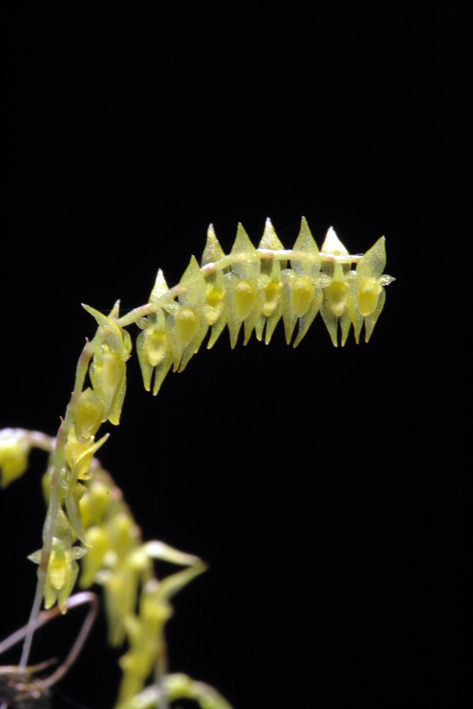 Found Haiti and the Dominican Republic at elevations around 950 meters as a mini-miniature sized, warm growing epiphyte with erect, slender ramicauls enveloped by around 4 to 7, lepanthiform sheaths with shortly ciliate ostia and carrying a single, apical, erect, coriaceous, margins mintely denticulate, elliptic, subacute to obtuse, cuneate below into the petiolate base leaf that blooms in the later spring on a filiform, congested, 2 ranked, 3.4" [8.5 cm] long, simulataneously many flowered inflorescence.