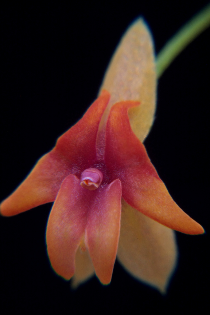 Found in Dominican Republic and Haiti at elevations around 1100 meters as a mini-miniature sized, warm growing epiphyte with erect, slender ramicauls enveloped by to 8, cornucopiate, marginate, apiculate lepanthiform sheaths and carrying a single, apical, erect, coricaeous, subsessile, broadly-ovate to suborbicular, marginate, with slarsely ciliate margins, subacuminate, bidentate-mucronate apically leaf that blooms on a fascile of up to 5, filiform, distally distichously arranged, densely successively single, to 12 flowered inflorescence with dilatate, acute, sparsely ciliate floral bract