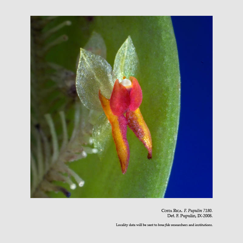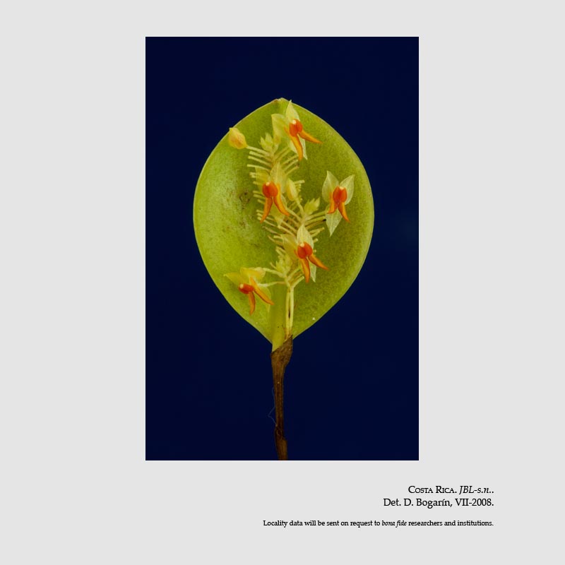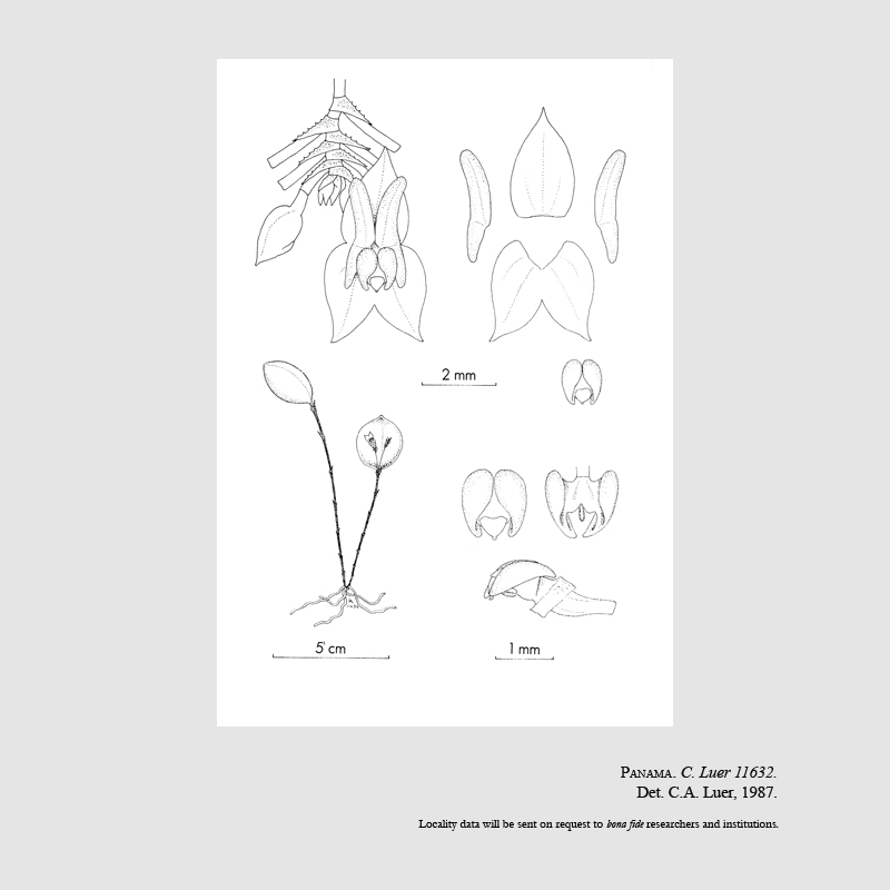 SynonymsReferences W3 Tropicos, Kew Monocot list , IPNI ; Lankester's Epidendra Website CR CHECKED Type OK; * Lindleyana 2: 188 Luer 1987 drawing fide; Orchid Digest Vol 73 #3 2009 drawing/photo fide; Lankestriana 11(3): 185-205 Bogarin 2011 Photo fide; Vanishing Beauty, Native Costa Rican Orchids Vol 2 Lacaena to Pteroglossa Pg 449 Pupulin 2020 photo fide