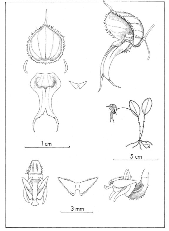 "This species is closely related to Bolivian Lepanthes nycteris, but the flowers are easily distinguished by the deeply concave, orbicular dorsal sepal. As in L. nycteris, the synsepal is con-cave in the basal third above which it is convex, where the sides recurve. The apices are contract-ed into acute tails. The lobes of the lip are tri-angular and retrorse." Luer 2001