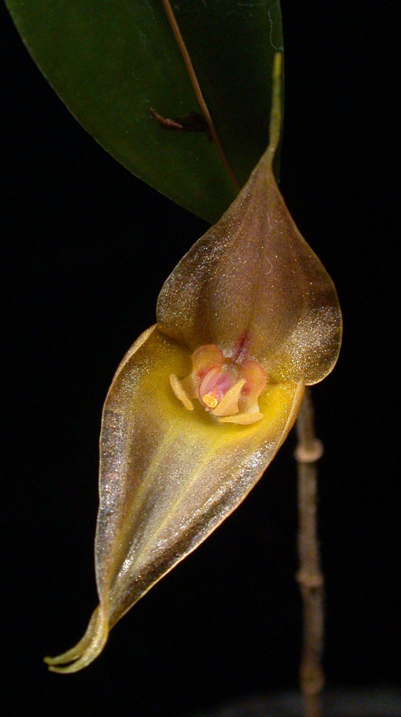 Found in southeastern Ecuador in forests around elevations of 1300 meters as a miniature sized, cool growing epiphyte with slender, erect, ramicauls enveloped basally by 4 to 7 ciliate, lepanthiform sheaths and carrying a single, apical, coriaceous, narrowly elliptic, acute leaf with the base cuneate into the petiole that blooms in the summer on a sub-congested, distichous, racemose, .4" [10 mm] long, successively few flowered inflorescence that holds the flower beyond the leaf.
