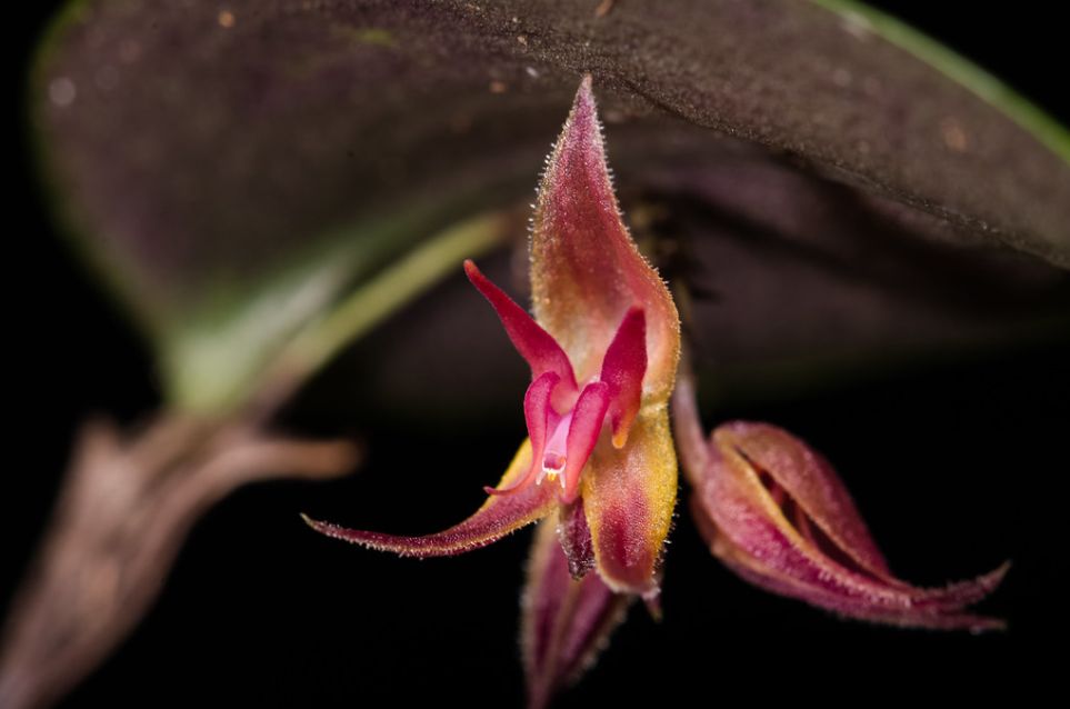 "The purple, elliptical leaves of this colorful species are abruptly contracted into a narrow, apical segment; the purple sepals edged in yellow are denticulate; the upper lobe of the petals is long and protruding, the lower lobe, very short; the narrow apices of the acuminate blades of the lip curve upward like a pair of tiny tusks." Luer & Escobar 1984