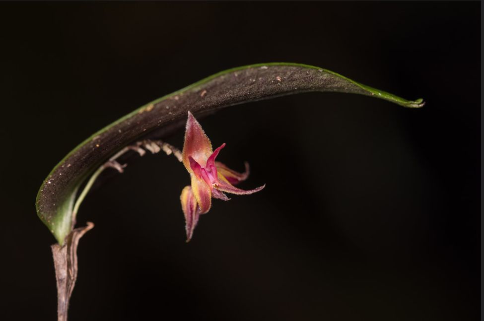Found in southwestern Colmbia to northern Ecuador at elevations around 3000 to 3500 meters as a mini-miniature to miniature sized, cold growing epiphyte with a stout, erect ramicaul enveloped by 7 to 12, minutely ciliate lepanthiform sheaths and carrying a single, apical, erect, coriaceous, purple suffused beneath, elliptical, obtuse and contracted into a narrow apical segment, rounded and contracted below into the petiolate base leaf that blooms in the summer on a slender, congested, distichous, to 2" [ 5 cm] long, successively many flowered inflorescence arising on the back of the leaf.