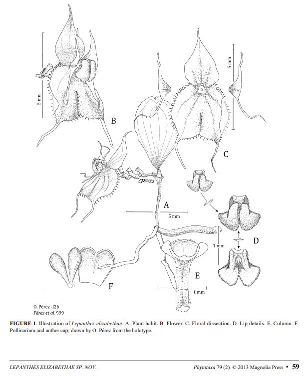 References W3 Tropicos, Kew Monocot list , IPNI ; * Phytotaxa 79 (2): 58–62 (2013) Lepanthes elizabethae (Pleurothallidinae, Orchidaceae), a new species from Colombia O.Pérez, Kolan & E.Par. 2013 Drawing/photo fide
