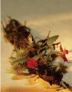 Found in Valle del Cauca department of Colombia in remnant cloud forests near creeks on Tibouchina trees at elevations of 1800 to 2000 meters as a mini-miniature sized, cool growing epiphyte with slender, erect ramicauls enveloped by 2 to 4, ribbrd lepanthiform sheaths with the ribs minutely denticulate and the ostia minutely ciliate and carrying a single, apical, suborbicular to obovate, obtuse, apex slightly folded towards the abaxial surface, cuneate and contracted below into the petiolate base leaf that blooms at least in in the fall on a short, horizontal, peduncle .064" [1.6 mm] long, borne from the abaxial surface of the leaf, racemose, secund, rachis 064" [1.6 mm] long, dense, successively single, few flowered inflorescence with cylindrical, shorter than the pedicel floral bracts.