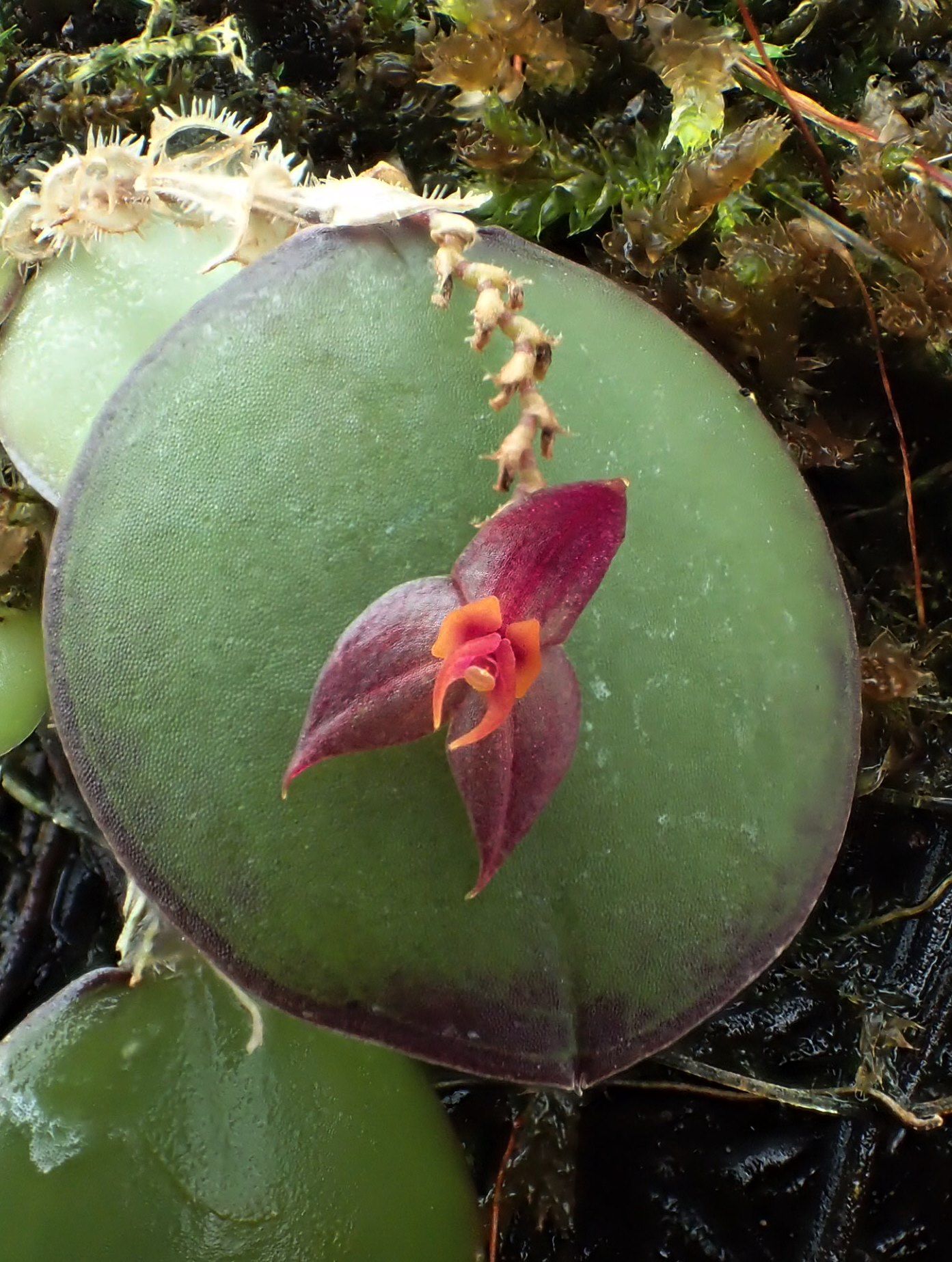 Found in Middlesex and St Catherine parishes of Jamaica at elevations around 600 to 900 meters as a mini-miniature sized, warm growing epiphyte with erect to somewhat arching, slender ramicauls enveloped by 6 to 8, long-ciliate, lepanthiform sheaths and carrying a single, apical, coriaceous, erect, more or less purple suffused beneath, elliptical, acute to subacute, cuneate below into the petiolate base leaf that blooms in the fall to winter on a filiform, congested, distichous, .4 to .52" [10 to 13 mm] long including the .12 to .24" [3 to 6 mm] long peduncle, successively single, several flowered inflorescence arising on the back of the leaf .